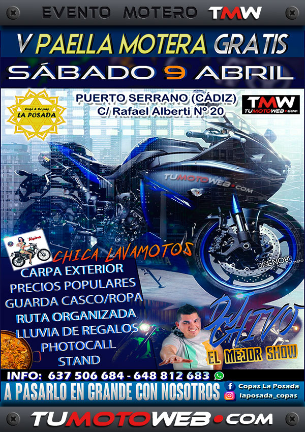 Sábado 9 de Abril: 10:00h Inicio de la V Paella Motera Gratis 2022. Habrá carpa exterior, guardacascos/ropa, photocall, stands merchandising, ruta organizada, el mejor show musical con Dj Chivo, lluvia de regalos, barra con precios populares, paella gratis, chica lavamotos, sorteos de regalos para moter@s.