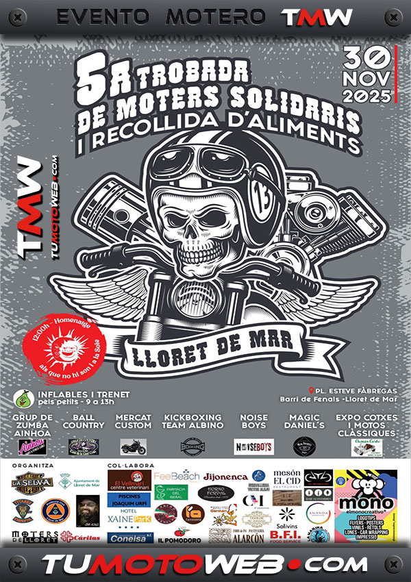 El domingo 30 de noviembre 2025 a partir de las 9:00h de la mañana, Moters de Lloret, Gaby Alonso y Titanes Valles Oriental CC organizan la V Trobada de Moters Solidaris en Lloret de Mar (Girona).