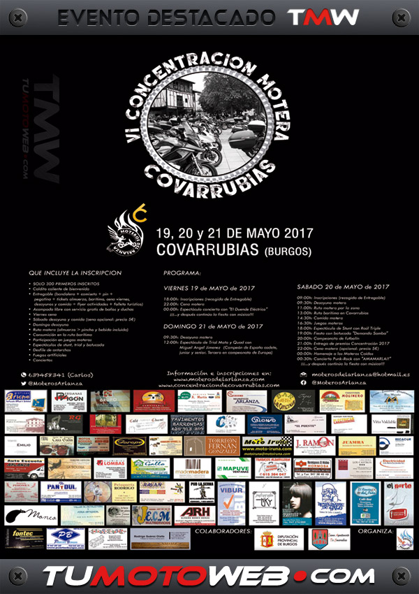Sábado 20 de Mayo. 09:00h: Inscripciones (recogida de Entregable). 09:30h: Desayuno motero. 11:00h: Ruta motera por la zona. 13:00h: Ruta barítima en Covarrubias. 14:30h: Comida motera. 16:30h: Juegos moteros. 18:00h: Espectáculo de Stunt con Raúl Triple. 19:00h: Fiesta con batucada Demanda Samba. 20:00h: Campeonato de futbolín. 21:00h: Entrega de premios Concentración 2017. 22:00h: Cena motera (opcional: precio 5€). 00:00h: Homenaje a los Moteros Caídos. 00:30h: Concierto Punk-Rock con Amamarla… y después continúa la fiesta con música.