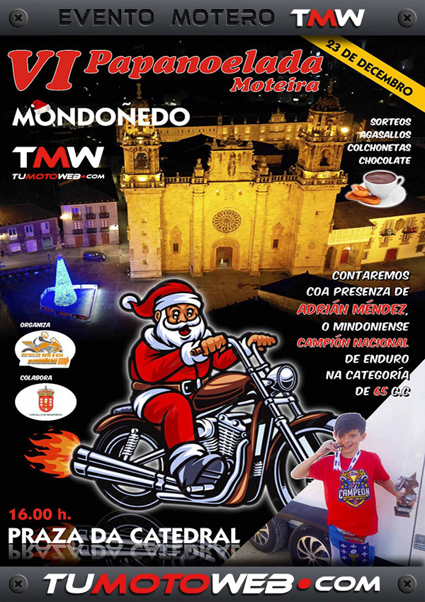 El sábado 23 de diciembre a partir de las 16:00h, el MotoClub Ruta N-634 organiza la VI Papanoelada Moteira 2023 en Mondoñedo (Lugo).