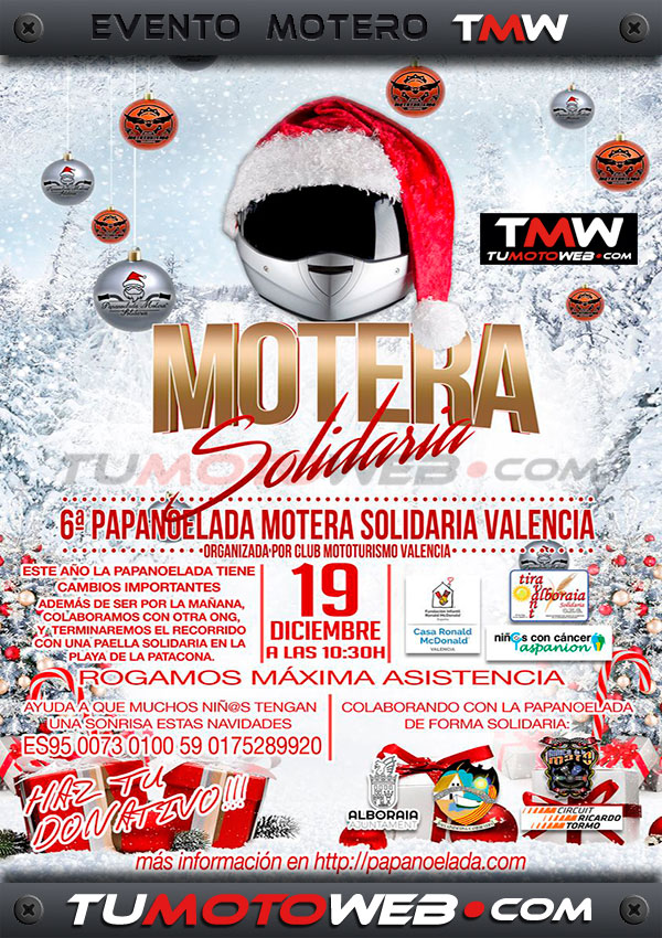 Domingo 19 de Diciembre: 10:30h Quedada en el parking del C.D. Zafranar (Bulevar Sur). Salida ruta mototurística disfrazados de Papá y Mamá Noel hacia las Asociaciones o Fundaciones con las que se colabora ese año. Con la lista de necesidades que nos transmitan, se les hará entrega de los artículos que se hayan podido comprar con el dinero recaudado, y pasaremos un rato con los peques y sus familias. Tras disfrutar de su compañía, reanudamos la marcha y realizamos un recorrido por el centro de la ciudad de Valencia hasta volver al punto de partida, dando por finalizada la Papanoelada.