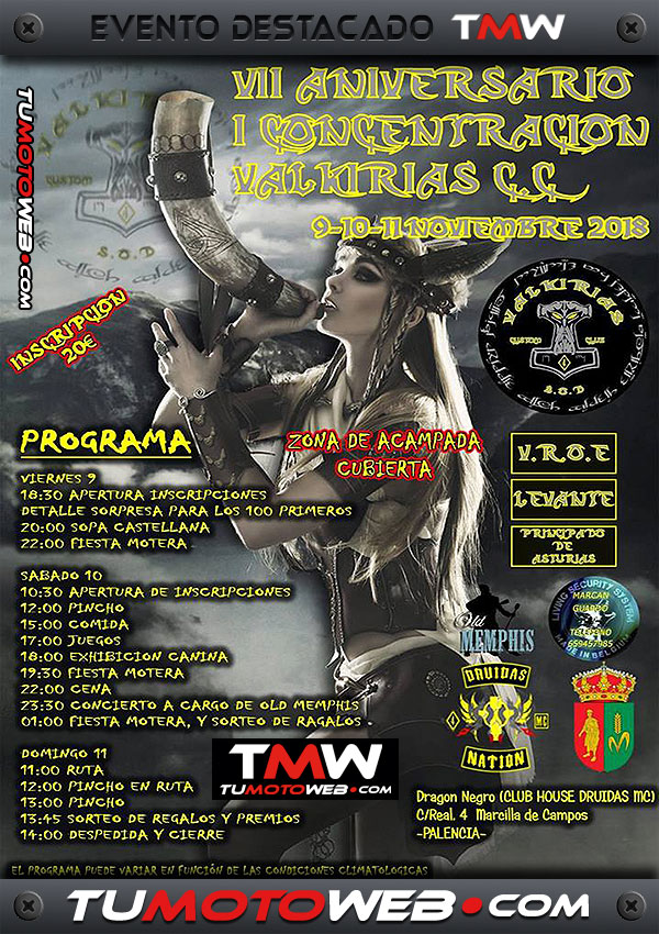 Domingo 11 de Noviembre: 11:00h Salida ruta motera. 12:00h Pincho en ruta. 13:00h Pincho. 13:45h Sorteo de regalos y premios. 14:00h Despedida y cierre. Os esperamos en Marcilla de Campos para celebrar nuestro VII Aniversario y I Concentración Valkirias CC. Te lo vas a perder?