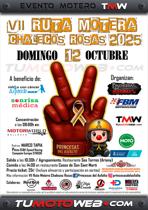 El domingo 12 de octubre 2025, Princesas del Asfalto junto a la Federación Balear de Motociclismo organizan la VII Ruta Motera Chalecos Rosas en Mallorca.