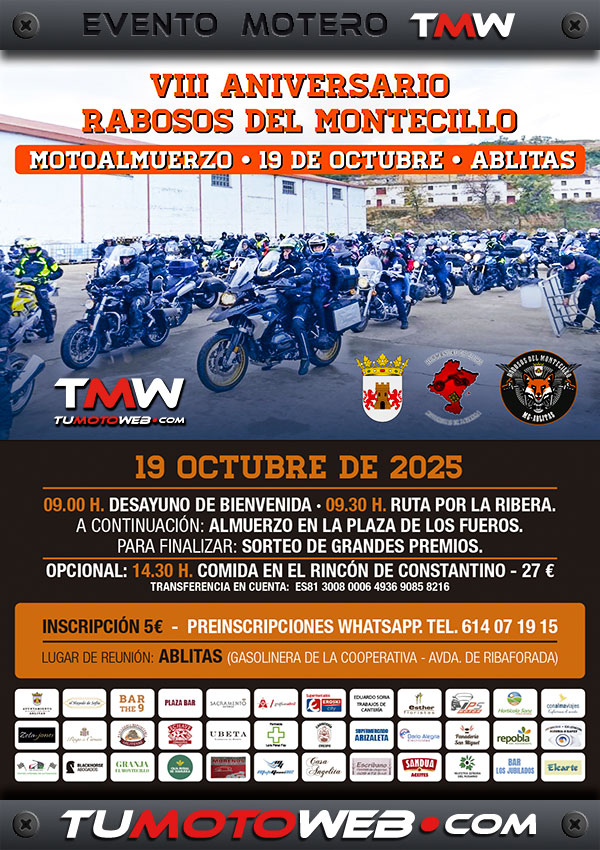 El domingo 19 de octubre 2025 a partir de las 9:00h de la mañana, Rabosos del Montecillo Moto Group celebra su VIII Aniversario en la localidad de Ablitas (Navarra).