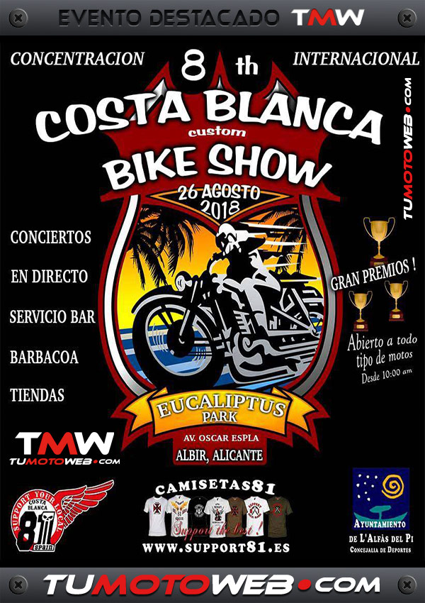 Domingo 26 de Agosto: 10:00h Abierto a todo tipo de motos. Entrada gratuita. Situado en el Parque de los Eucaliptos – El Albir (Alfáz del Pi – Alicante). Conciertos de Rock en directo, tiendas, barbacoa, servicio bar, grandes premios. Un año más te esperamos en el Bike Show de la Costa Blanca. No te lo puedes perder..!!