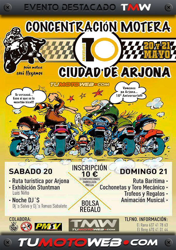 Domingo 21 de Mayo: Ruta barítima justo después de pasar la vuelta ciclista (se calcula sobre las 12:00h), donde cómo todos los años la Cafetería Chuchy y el Mesón Campero nos invitarán a una cerveza para todos los asistentes. De vuelta al recinto continuará la fiesta con los Dj’s, colchonetas para los peques y toro mecánico para demostrar como montamos (todo gratis). 16:00h Entrega de trofeos y sorteo de regalos para los inscritos. Os esperamos en Arjona..!!