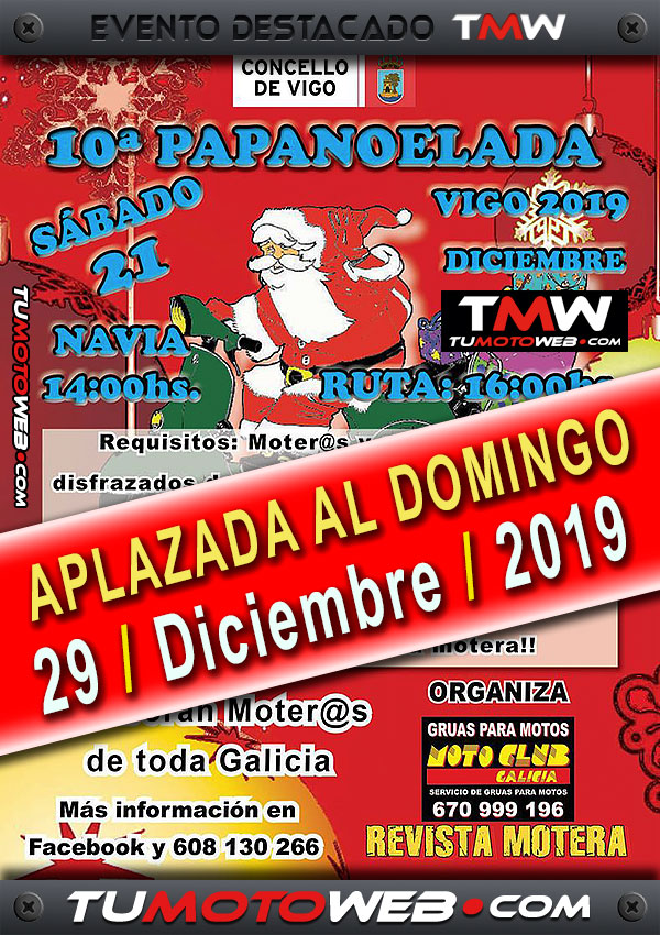 Domingo 29 de Diciembre: 14:00h Recogida de alimentos para el Banco de Alimentos de Vigo. Para organizar este evento motero benéfico necesitamos la colaboración de todos los MotoClubs y moteros que quieran unirse. Requisito indispensable, venir disfrazado de Papá Noel tanto el piloto como el acompañante y traer caramelos. 16:00h Salida ruta motera por las calles de Vigo. Finalizamos con fiesta motera. Colaboran moter@s de toda Galicia. Desde ya agradecemos vuestra asistencia. Os esperamos a tod@s en Navia, por una buena causa..!!