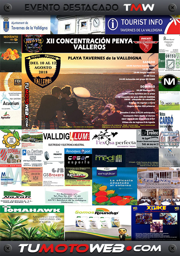 Domingo 12 de Agosto: 9:00h Matinal. Apertura de inscripciones (9 €). 11:00h Vuelta turística por la playa. 11:30h Exhibición Stunt a cargo del gran Emilio Zamora. XBike (simulador de caballitos). Entrega de regalos y cierre. No te lo pierdas, te esperamos en Tavernes de la Valldigna..!!