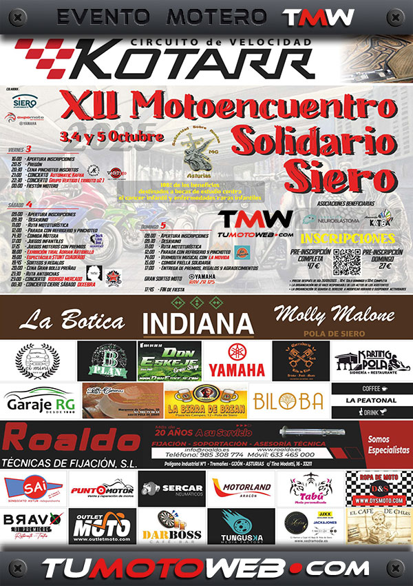 Del viernes 3 al domingo 5 de octubre de 2025, la Asociación Solidaridad Sobre Ruedas organiza el XII Moto Encuentro Solidario en la localidad de Pola de Siero (Asturias).