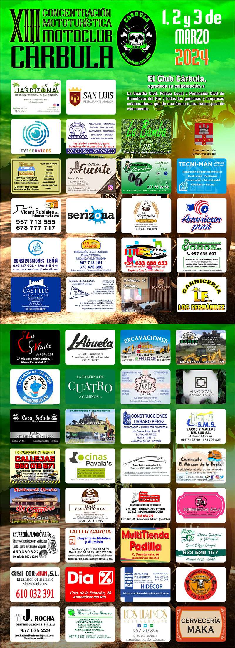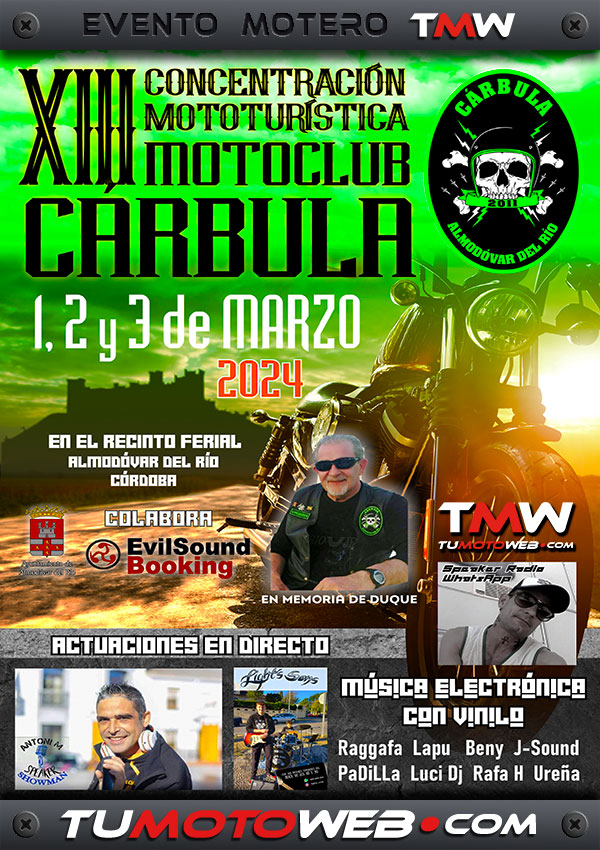 Desde el viernes 1 al domingo 3 de marzo 2024, el MotoClub Cárbula organiza su XIII Concentración Mototurística en Almodóvar del Río (Córdoba).