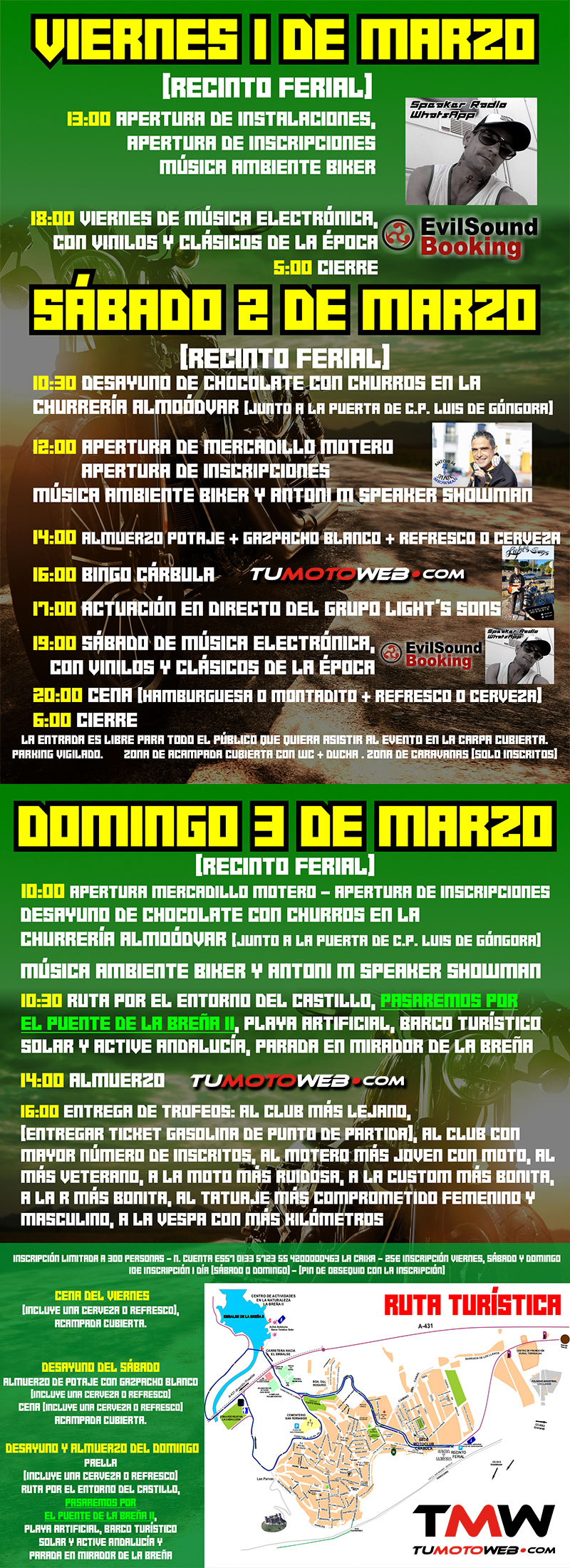 Un evento motero abierto a todo tipo de motos con… entrada libre, inscripción opcional, parking vigilado, zona de acampada cubierta con WC y duchas, mercadillo motero, actuaciones musicales en carpa cubierta, ruta mototurística, entrega de trofeos, buen ambiente biker y mucho más.
