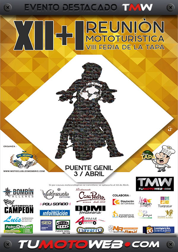 Domingo 3 de Abril: 11:00h Apertura de casetas para venta de inscripciones. Las inscripciones (opcionales) tienen un precio de 10 € e incluyen 1 bolsa de regalo con camiseta de diseño especial, 5 tickets para la Feria de la Tapa y además, el cartón de inscripción numerado para los sorteos de material motero. 12:30h Inauguración de la Feria de la Tapa 2016, donde disfrutaremos de una amplia variedad de tapas para degustar en la calle principal y más animada de la localidad, especialmente ese día con moteros de unos y otros lares. También habrá atracciones infantiles para los moteros más peques. 16:30h Sorteo de regalos en el escenario, hasta fin de existencias. El cierre de las taquillas de venta de tickets será a las 18:30h. Os esperamos otro año mas en Puente Genil..!!