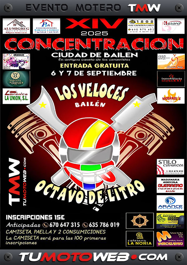 El sábado 6 y domingo 7 de septiembre de 2025, Los Veloces Octavo de Litro organizan la XIV Concentración Motera en la localidad de Bailén (Jaén).