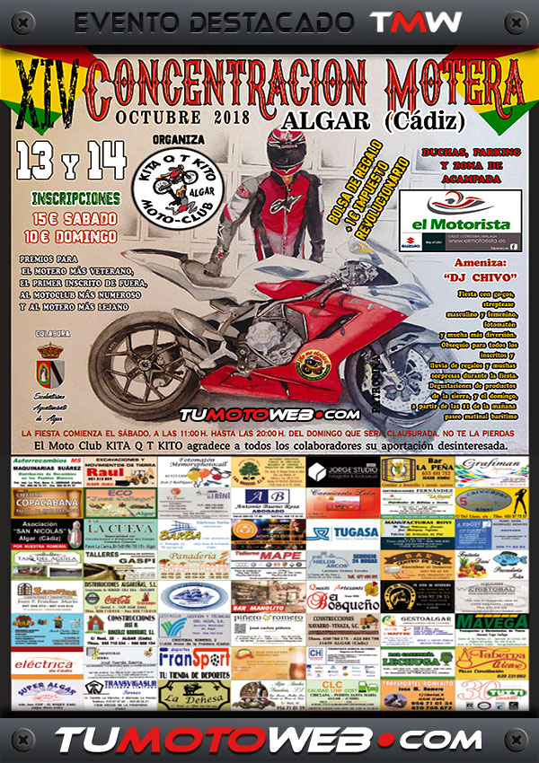 Fin de semana 13 y 14 de Octubre: Sábado: 11:00h Apertura de inscripciones (15 € Sábado / 10 € Domingo / 1 € de impuesto revolucionario), bolsa de regalo con obsequio para todos los inscritos, zona de acampada con duchas, parking, fotomatón, degustación de productos de la sierra, fiesta con Dj Chivo, Go-go’s, striptease masculino y femenino, lluvia de regalos y muchas sorpresas durante la fiesta. Domingo: 11:00h Paseo matinal barítimo. Animación con Dj Chivo. Entrega de premios (Motero más veterano, 1º Inscrito de fuera, MotoClub más numeroso, Motero más lejano). Clausura de la fiesta a las 20:00h. Colabora el Excmo. Ayuntamiento de Algar. Patrocina El Motorista. Os esperamos un año más en Algar (Cádiz)..!!