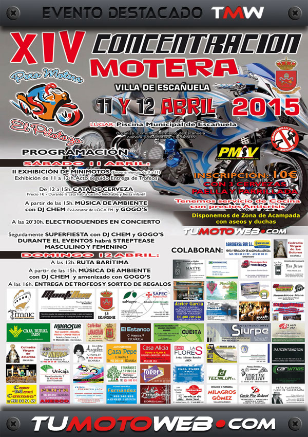 Sábado: Apertura de inscripciones, la cual incluye 3 cervezas, paella y parrillada, disponemos de zona de acampada con aseos y duchas, servicio de cocina con precios anticrisis, II Exhibición de Minimotos con entrega de trofeos, cata de cerveza, castillo hinchable y fiesta infantil, música de ambiente, concierto en directo a cargo de Electroduendes y seguidamente Super-Fiesta con Dj Chem (ex-locutor de Loca FM), Go-Go’s y striptease masculino y femenino. Domingo: Ruta barítima, música de ambiente con Dj Chem y amenizado con Go-Go’s, entrega de Trofeos y sorteo de regalos. Os esperamos en Escañuela..!!