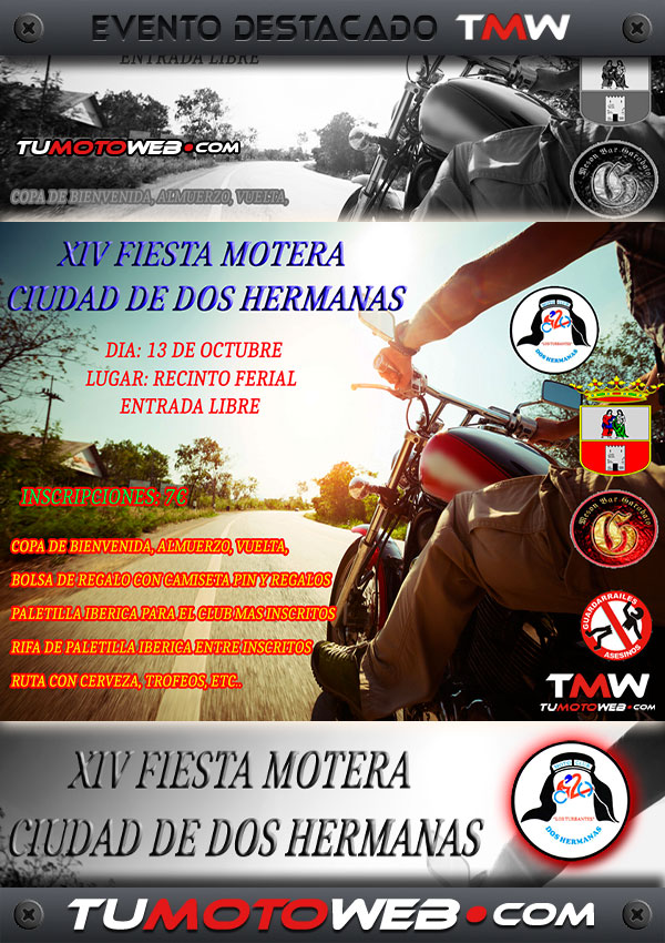 Domingo 13 de Octubre: 10:00h Entrada libre. Apertura de inscripciones (7 €), copa de bienvenida, bolsa de regalo con camiseta, pin, regalos varios. 11:30h Juegos (coger la cinta, lanzamiento de gomas y carreras de sacos). 12:30h Salida ruta barítima con cerveza. Regreso al Recinto Ferial. 14:00h Almuerzo. 15:00h Entrega de trofeos (MotoClub con más inscritos, motero con carnet más antiguo, moto mas nueva, ganadores de los juegos, bandera más chula), paletilla ibérica para el MotoClub con más inscritos, rifa de una paletilla ibérica entre los inscritos. Precios populares. Os esperamos un año más en Dos Hermanas. ¿Te lo vas a perder?