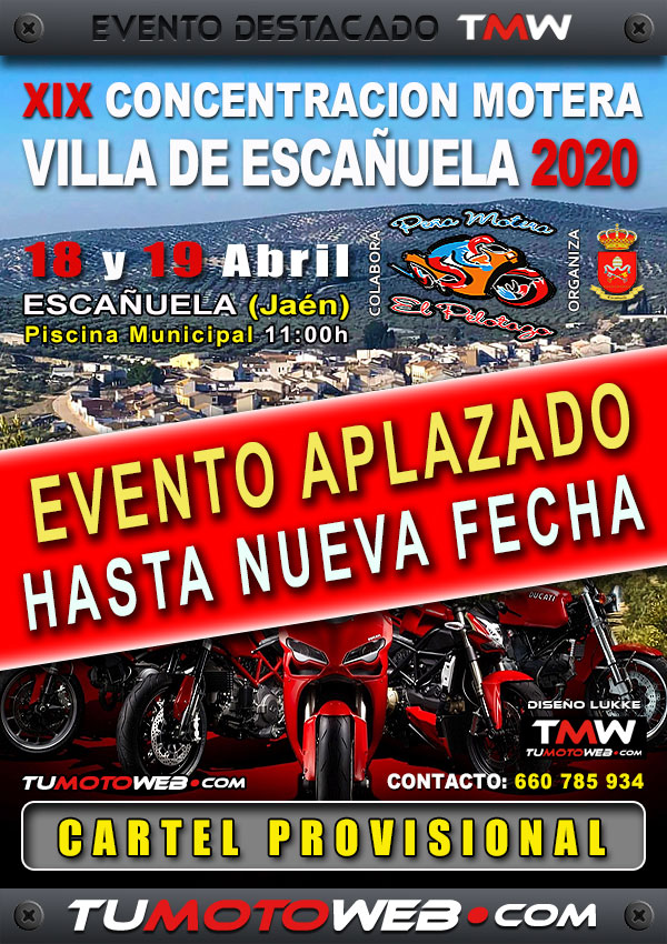 La Peña Motera El Pelotazo ha comunicado a Tumotoweb.com que tras una reunión mantenida con miembros del Ayuntamiento de Escañuela y por prevención ante la actual situación del Coronavirus, ha decidido APLAZAR HASTA NUEVA FECHA la XIX Concentración Motera Villa de Escañuela 2020, prevista celebrarse el Sábado 18 y Domingo 19 de Abril 2020 en la Piscina Municipal de Escañuela (Jaén).