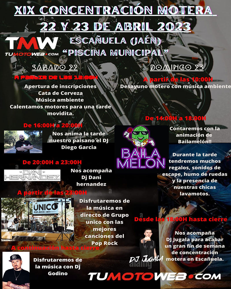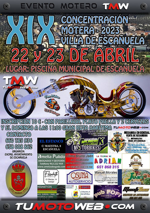 El Ayuntamiento de Escañuela y la Peña Motera El Pelotazo organizan el sábado 22 y domingo 23 de abril, la XIX Concentración Motera Villa de Escañuela 2023.