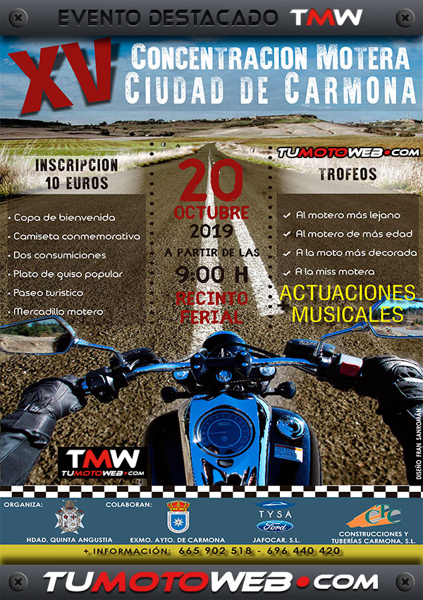 Domingo 20 de Octubre: 9:00h Apertura de inscripciones (10 €) en el Recinto Ferial, la cual incluye copa de bienvenida, camiseta conmemorativa, artículos informativos de nuestros monumentos históricos, dos consumiciones, plato de guiso popular. 13:00h Ruta por el centro histórico de la ciudad, mercadillo motero, actuaciones musicales, sorteo de regalos entre los inscritos y entrega de trofeos (Motero más lejano, Motero más veterano, Miss Motera y Moto más decorada). Vive tu pasión en Carmona. No faltes..!!