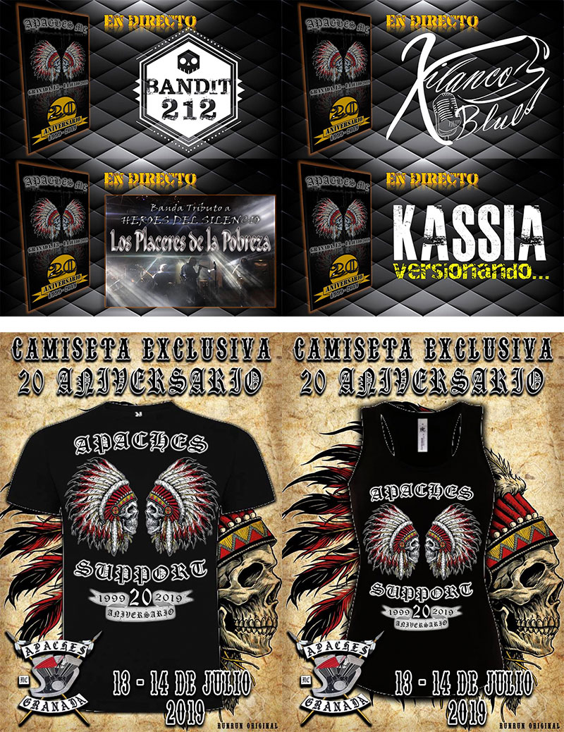 Sábado 13 y Domingo 14 de Julio: Este año celebramos el XX Aniversario Apaches MC Granada. Entrada libre. Varios conciertos en directo. Camisetas exclusivas XX Aniversario para hombre y mujer. Lo pasaremos en grande. Os esperamos..!!