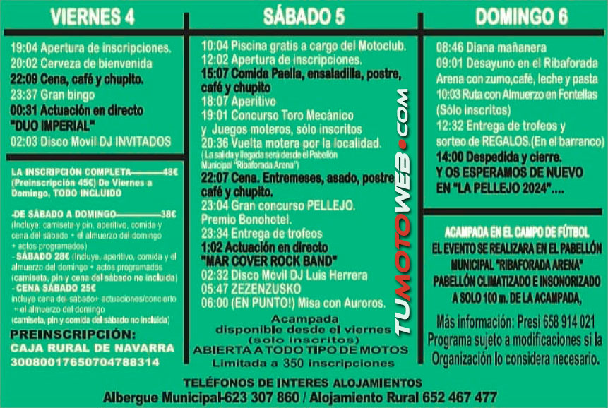Un evento motero en plena comarca de Tudela con… zona de acampada, cerveza de bienvenida, actuaciones musicales, discomóvil, Dj’s, concursos, vuelta motera, entrega de trofeos, sorteo de regalos y mucho más.