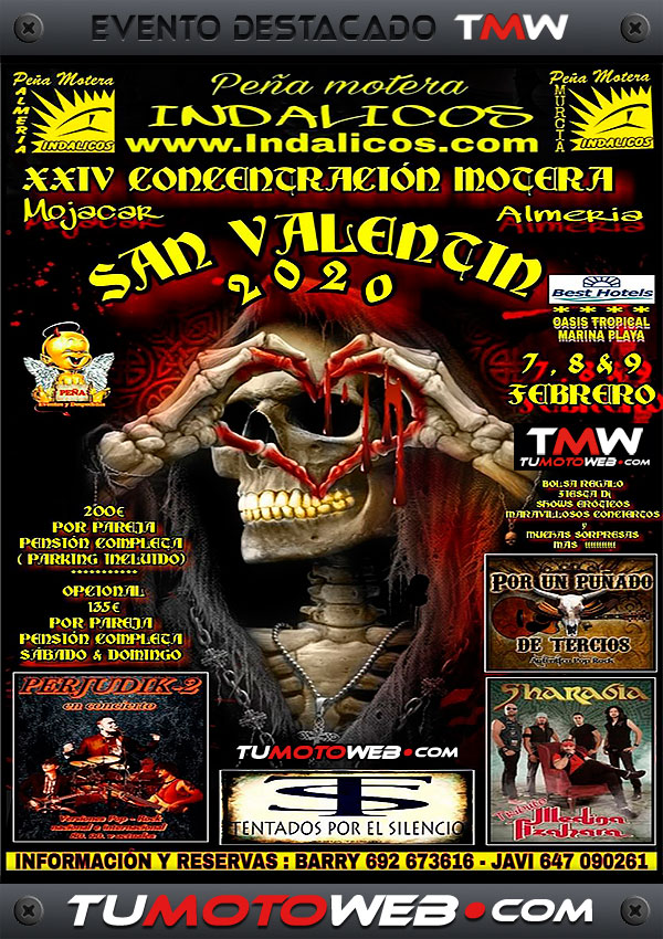 Viernes 7 al Domingo 9 de Febrero: Este año celebramos nuestra XXIV Concentración Motera San Valentín 2020, en el Hotel Best Oasis Tropical **** (Mojácar – Almería). Bolsa regalo, parking privado, fiesta con Dj, cuatro conciertos en directo a cargo de… Por Un Puñado De Tercios / Tentados Por El Silencio / Perjudik-2 / Sharabia (tributo a Medina Azahara), shows eróticos, ambiente biker y muchas sorpresas más. Ven y disfruta un genial fin de semana con tu pareja o con tus amigos. Un año más os esperamos a tod@s en Mojácar. Que no te lo cuenten..!!
