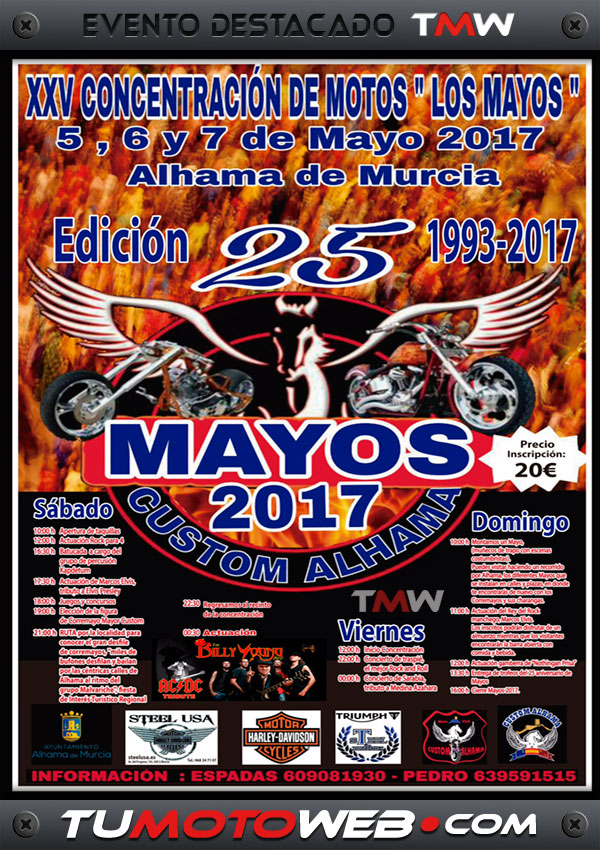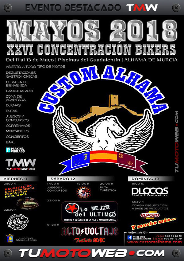 Fin de semana 11, 12 y 13 de Mayo: Celebramos la XXVI Concentración Custom & HD Mayos 2018. Abierto a todo tipo de motos. Cerveza de bienvenida. Camiseta 2018. Zona de acampada. Duchas. Parking vigilado. Degustaciones gastronómicas. Rutas. Juegos y concursos. Corremayos. Mercadillo. Conciertos en directo (FYV Band / Marcos Elvis / Lo Mejor del Último (tributo Último de La Fila + Manolo García) / Alto-Voltaje (tributo AC-DC) / DLocos (tributo a El Canto del Loco). Bar. Entrega de trofeos. Os esperamos una año más en Alhama de Murcia..!!