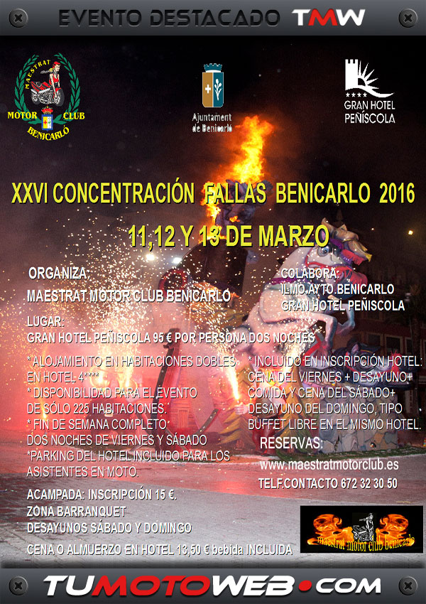 A través de la web oficial del Maestrat Motor Club, tienes toda la información necesaria sobre la XXVI Concentración Motera Fallas Benicarló 2016. Además se puede realizar tanto la inscripción para la Concentración, como la reserva de habitaciones para el Gran Hotel Peñiscola ****.