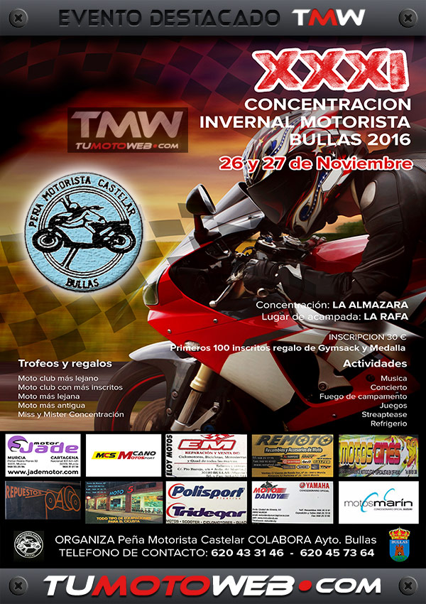 Sábado 26 de Noviembre: 15:30h Apertura de inscripciones en el Centro Juvenil La Almazara, regalo de gymsack y medalla para los 100 primeros inscritos, fiesta de bienvenida. Acampada en Camping La Rafa (Paraje la Rafa, s/n – 30180 Bullas). 19:30h Recorrido por el pueblo y parada en diferentes bares colaboradores. 22:30h Cena. 23:30h Concierto en la Almazara. 1:00h Striptease y show erótico.