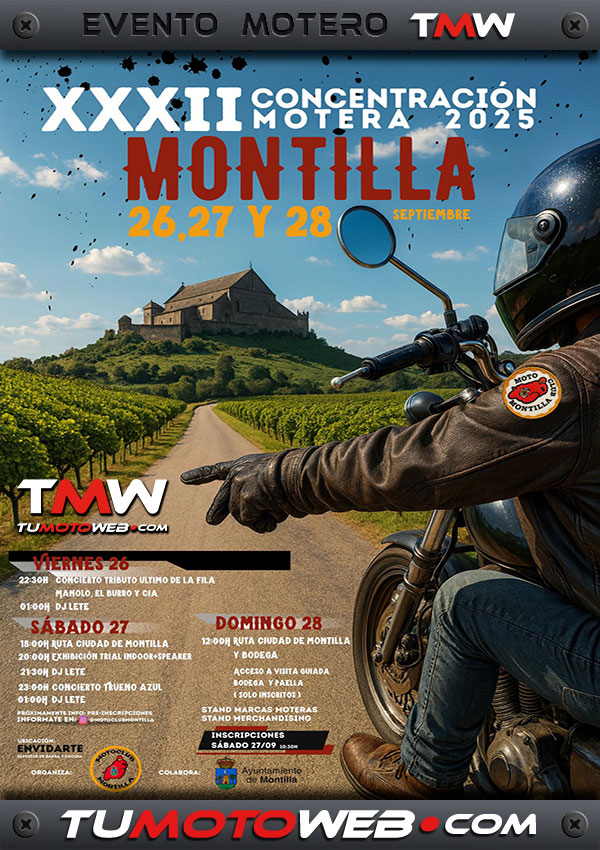 Desde el viernes 26 al domingo 28 de septiembre 2025, el MotoClub Montilla organiza la XXXII Concentración Motera en la localidad de Montilla (Córdoba).