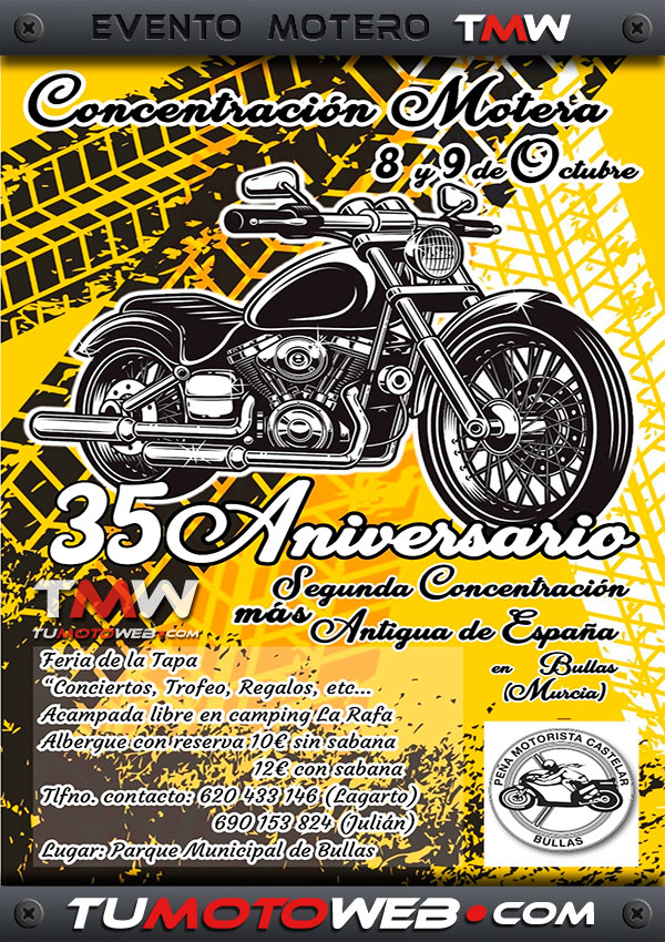 La Peña Motorista Castelar celebra el XXXV Aniversario de la Concentración Motorista de Bullas. Un año más os esperamos en Bullas (Murcia), para disfrutar todo un fin de semana con el mejor ambiente motero. No te la pierdas..!!