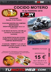 Sábado 16 de Febrero: 10:00h Encuentro en el Camping Monfragüe. Apertura de inscripciones (15 €). Desayuno motero (migas con huevo frito). 11:00h Inicio de ruta (140 kms por carreteras secundarias y de montaña). Espectacular cocido completo en Restaurante Camping Monfragüe. 17:30h Si el tiempo y la luz lo permiten, paseito guiado en moto por Monfragüe...
