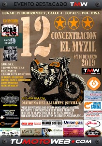 Sábado 9 y Domingo 10 de Marzo: XII Concentración Motera El Myzil 2019. Este año cambiamos la ubicación del lugar del evento. Será en nuestra propia sede La Base del Myzil (Polígono Pisa - Calle Horizonte, 7 - Mairena del Aljarafe - Sevilla). 12:00h Apertura, la máquina del infierno, juegos antiestrés, música en directo, ruta barítima, sorteos, stands, espectáculos y un fenomenal ambiente biker...