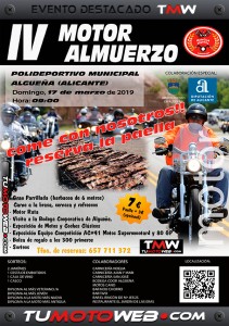 Domingo 17 de Marzo: 9:00h Apertura de inscripciones (7 €), bolsa regalo para los primeros 300 inscritos. Este año la novedad es que tendrás la opción de quedarte a comer 1 plato de paella + 1 bebida y pan por solo 3 € más (tickets disponibles hasta las 12:00h). Almuerzo en una gran parrillada (1 aperitivo + 1 plato de carne a la brasa con pan + 1 bebida). Fantástica exposición de motos y coches clásicos durante la mañana, exposición del equipo de competición del piloto local Aitor Cremades (AC#41). 12:00h Salida Motor Ruta que acabará con la visita a la Bodega Cooperativa de Algueña...