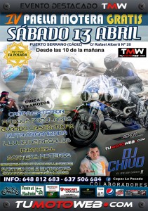 Sábado 13 de Abril: 10:00h Carpa exterior, guardacascos/ropa, photocall, ruta organizada, la mejor música con Dj, paella gratis, entrenos MotoGP en pantalla gigante, sorteo de 2 entradas para el Gran Premio de España de Jerez, chica lavamotos, lluvia de regalos, sorteos para el motero. Precios populares...
