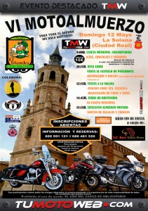 Domingo 12 de Mayo: 9:00h Apertura de inscripciones (15 €) en la Caseta Municipal (junto al Recinto Ferial), bolsa de regalo a los 150 primeros inscritos (mochila y camiseta), desayuno incluido (café, chocolate y churros). 10:15h Ruta motera libre. Visita al Castillo de Peñarroya. Refrigerio y bocata para todos los inscritos (no inscritos 2 €). 12:15h Regreso a La Solana. Parada en la Cooperativa Santa Catalina, con degustación de vinos y tapas. 14:45h Zurra (sangría) de bienvenida en Caseta Municipal. 15:15h Suculento almuerzo motero. Sorteo de regalos...