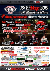 Sábado 18 y Domingo 19 de Mayo: En esta ocasión la IV Maxi Concentración Moteros Alhaurín 2019, serán dos días. Entrada gratuita al recinto. 10:00h Apertura de inscripciones (12 € / Solo 500 inscripciones). Stands moteros de las primeras marcas, ruta motera por Alhaurín de la Torre, pantalla led gigante, MotoGP en directo, Dj Chivo, Speaker Andy Seven (locutor de radio), Sebas Garrido Padrino 2019, exhibición Ducati Stunt a cargo de Emilio Zamora, juegos moteros...