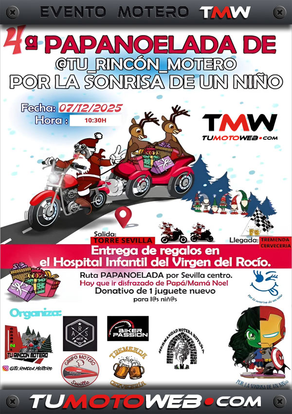 El domingo 7 de diciembre 2025 a partir de las 10:30h de la mañana, Tu Rincón Motero organiza su IV Papanoelada Motera Solidaria en Sevilla... Más Información »