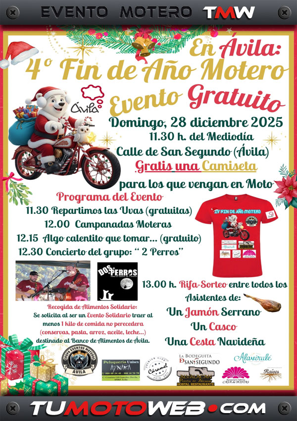 El domingo 28 de diciembre 2025 a partir de las 11:30h del mediodía, tendrá lugar la cuarta edición del Fin de Año Motero Solidario en Ávila... Más Información »