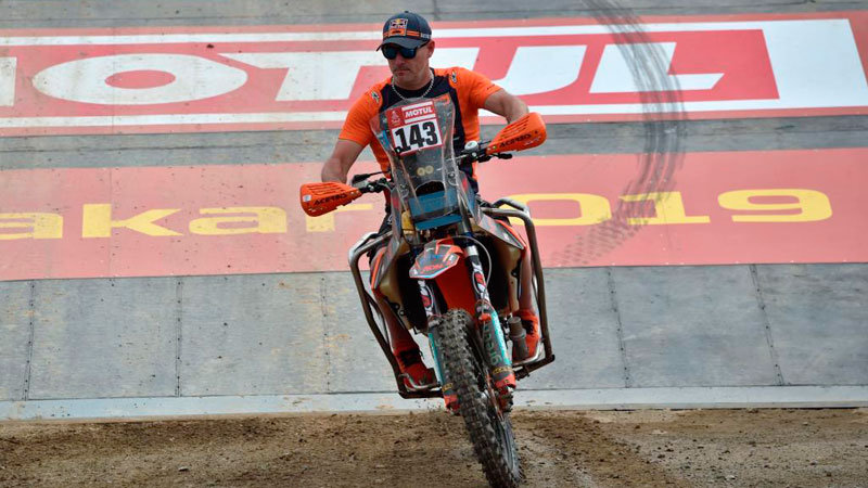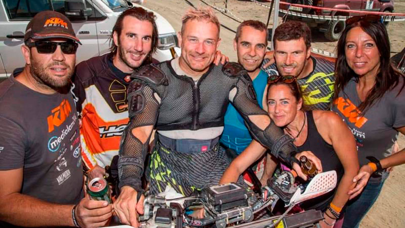 Para poder tomar la salida ha tenido que cumplir con los mismos requisitos que cualquier otro piloto de motos: acabar una carrera del Dakar Series o del Mundial de Raids. Tras el accidente sucedido en 2010, nunca imaginó que volvería a montar en moto, pero sabía que quería seguir en las carreras, aunque fuese como promotor. Luego empezó a correr en buggy, pero se dio cuenta que lo que más le gustaba era la moto. Así que volvió, fue adaptando su pilotaje y dos años después ya tenía el equilibrio perfecto, empezó a hacer carreras y pensaron: ¿Por qué no correr el Dakar?”.