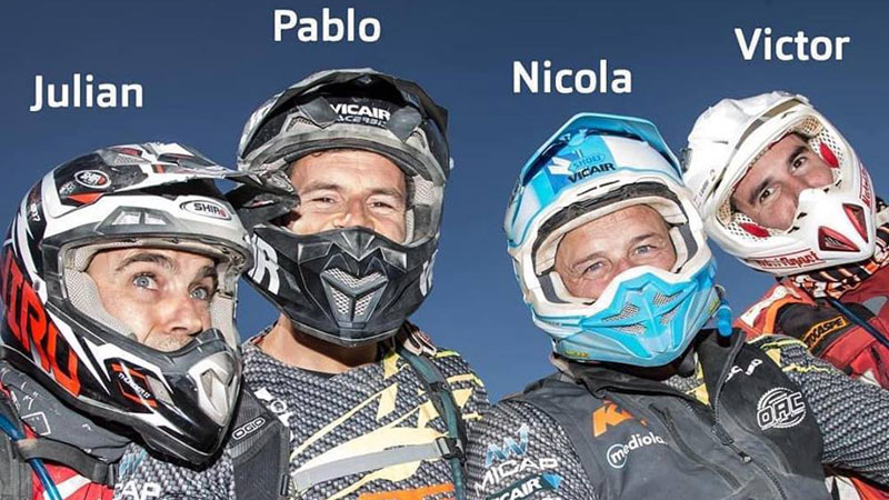 Nicola Dutto es el primer piloto parapléjico de motos que intenta vencer al Dakar sólo con ayuda de sus brazos y el apoyo de sus 3 ángeles guardianes españoles (Víctor, Pablo y Julián).