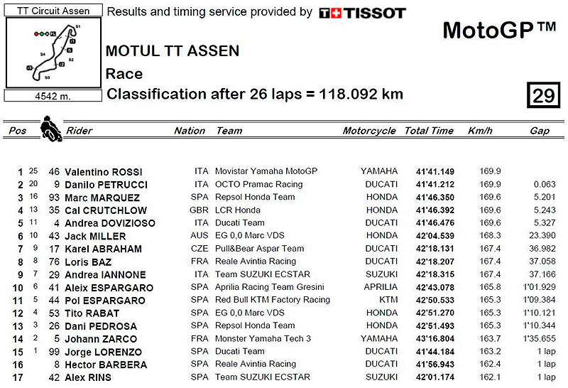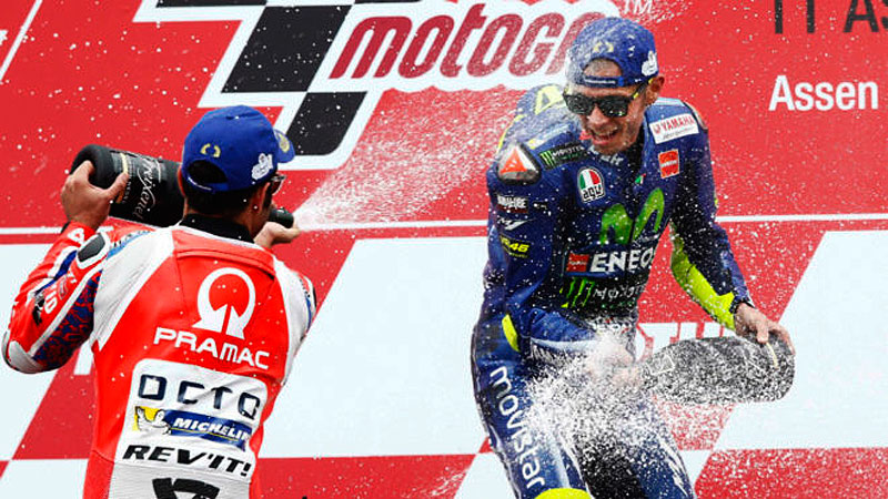 Valentino Rossi ganó una carrera imprevisible en Assen. Es su décimo triunfo y se lo tuvo que trabajar de lo lindo ante Petrucci. Márquez salvó un podio tras una gran pelea con Crutchlow y Dovi. Viñales se cayó al remontar.